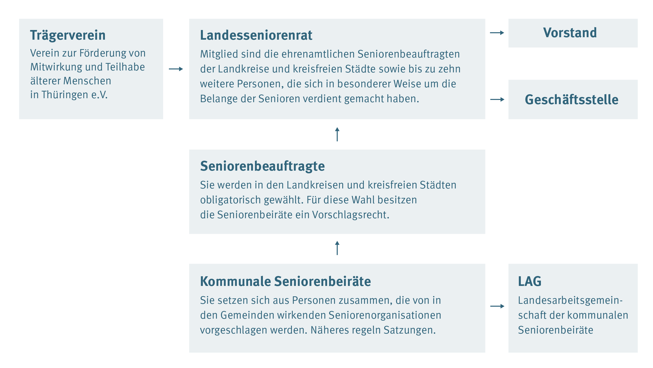 Der Landesseniorenrat ist eine Organisation „sui generis“. Er besitzt keinen Rechtsstatus, sondern wird qua Gesetz als Beratungsorgan gebildet. Der Trägerverein ist der Rechtsvertreter des Landesseniorenrates und fördert damit die Arbeit des LSR. Über ihn werden Verträge abgeschlossen, Mittel beantragt, verwaltet und abgerechnet. Er setzt sich autonom qua seiner Satzung für die Förderung von Mitwirkungs- und Teilhaberechte ein.